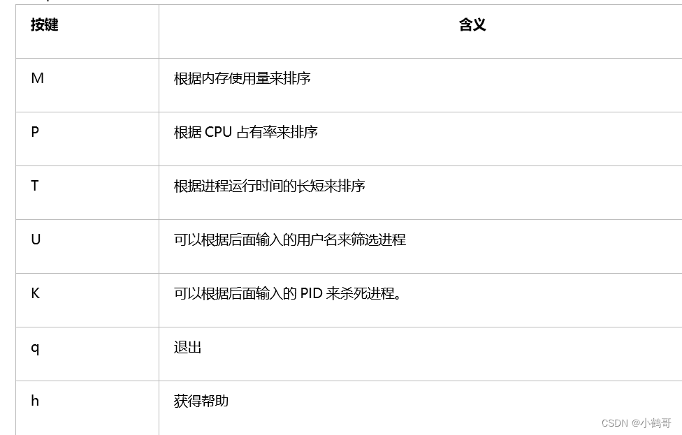 在top命令执行后,可以按下按键得到对显示的结果进行排序: